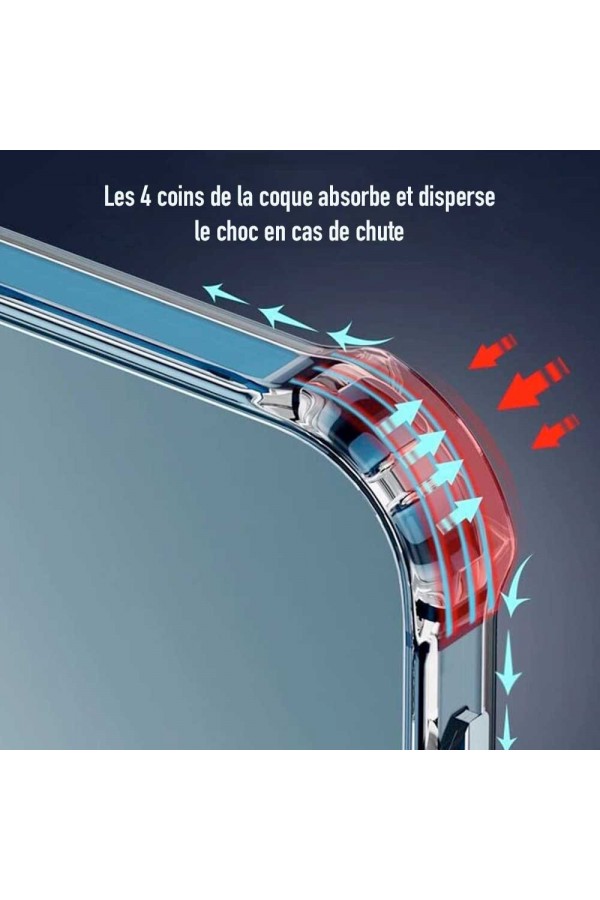 Cette coque antichoc en polycarbonate transparent et de matériaux souples, elle s’ajuste parfaitement à votre iPhone, laissant apparaître le design de celui ci.